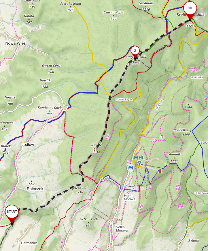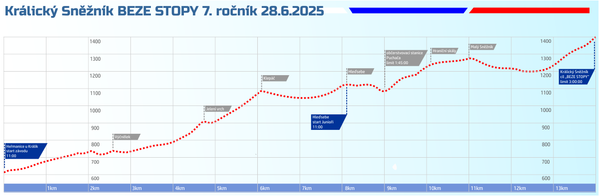 Heřmanice - 500 m na hranici s PL - výstup na Klepáč - Hleďsebe - sedlo Puchača (občerstvovací stanice, časový limit 1:45:00) - Malý Sněžník - Králický Sněžník (časový limit 3:00:00 - tj. 14:00)